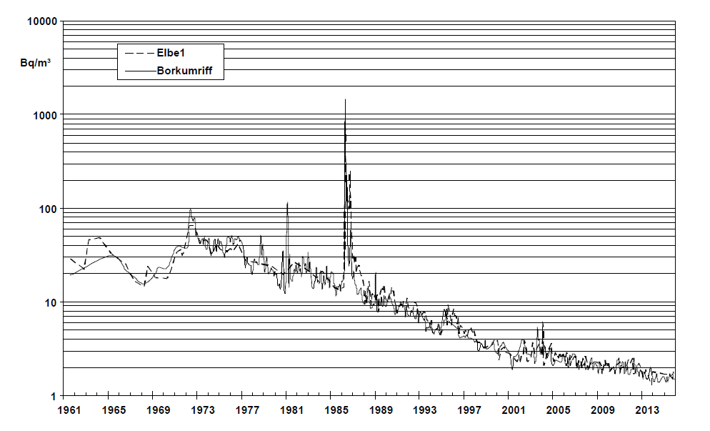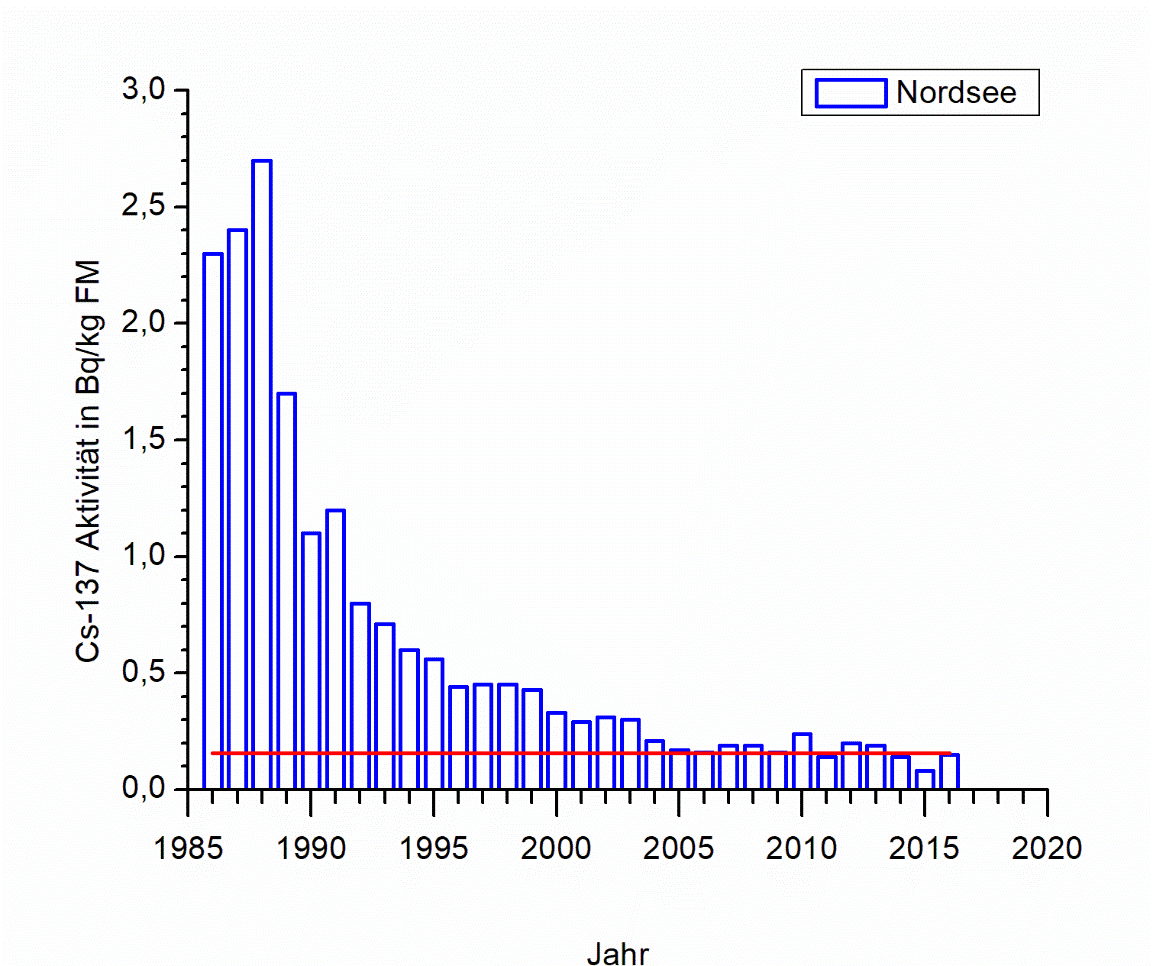 Aufgrund seiner Halbwertszeit von 30 Jahren kommt das Radionuklid Cäsium-137 in der Umwelt aus natürlichen Quellen nur in sehr geringen Konzentrationen vor. Üblicherweise wird davon ausgegangen, dass Radionuklide über 10 Halbwertszeiten gut nachweisbar sind. In der Meeresumwelt nachgewiesene Aktivitätskonzentrationen stammen aus den oberirdischen Kernwaffentests der 1950er und 1960er Jahre, der Einleitungen der europäischen Wiederaufbereitungsanlagen für Kernbrennstoffe und Unfällen in kerntechnischen Anlagen. In Abbildung 1 ist der Konzentrationsverlauf von Cäsium-137 im Wasser der Deutschen Bucht seit Aufnahme der Meeresumweltüberwachung im Rahmen des EURATOM-Vertrags gezeigt. Die anfängliche Cäsium-137 Aktivitätskonzentration geht dabei auf die oberirdischen Nuklearwaffentests und die Erhöhung von 1970 bis Anfang der 1980er Jahre auf die Einleitungen der europäischen Wideraufbereitungsanlagen zurück. Auch der Eintrag aus dem Unfall im ukrainischen Kernkraftwerk Tschernobyl im Jahr 1986 ist deutlich sichtbar.
