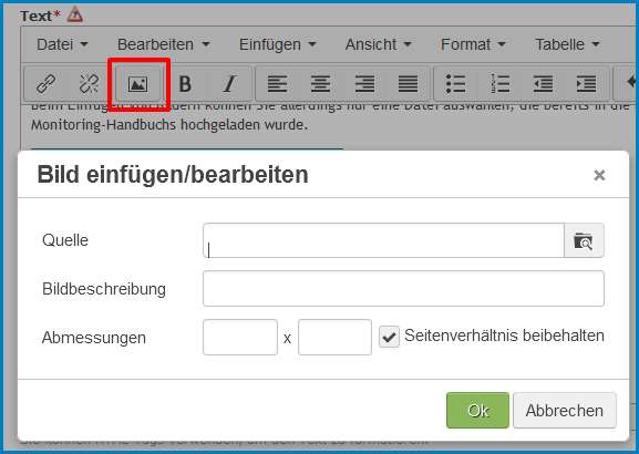 Hier können Sie "Ein Bild hinzufügen" (nach Ankreuzen des Auswahlfeldes). Als Quelldatei können Sie allerdings nur eine Datei auswählen, die bereits in die Dateiverwaltung des Monitoring-Handbuchs hochgeladen wurde.